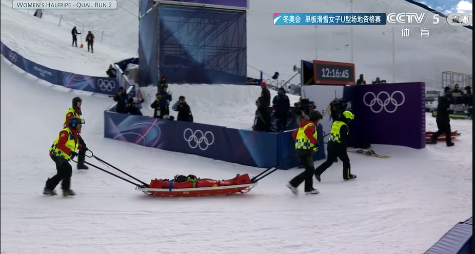 医务人员第一时间进场检查,随后救援队员用雪橇将刘佳宇送入场地医疗室。记者向医务人员初步了解到,刘佳宇系头部磕碰,目前意识清醒。